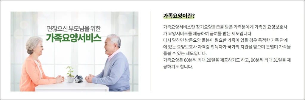 요양보호사 자격증을 보유한 가족이 장기요양 수급자인 가족 구성원을 직접 돌보고 급여를 받는 방식입니다.