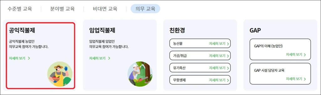 - 카테고리에서 “공익직불제 의무교육”을 선택하거나 검색창에 입력하셔도 됩니다.