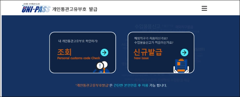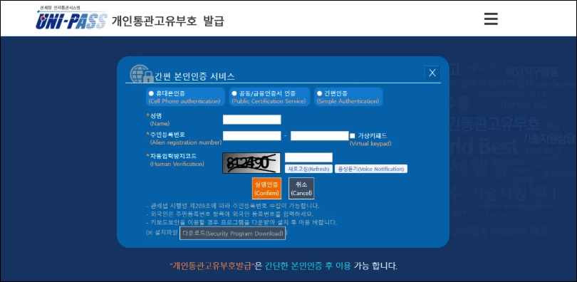 관세청 UNI-PASS(https://unipass.customs.go.kr/csp/persIndex.do) 접속 후 진행하며, 5분 소요됩니다.