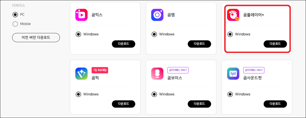 Windows (유료) | 곰플레이어 플러스 (Plus) | 64비트 최적화, 광고 제거, 기술 지원 우선 제공 |