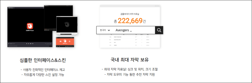 자막 지원 | 다양한 언어 자막 자동 검색 및 싱크 조정 가능 | 자막 싱크 불일치 문제를 간편하게 조정 가능 |