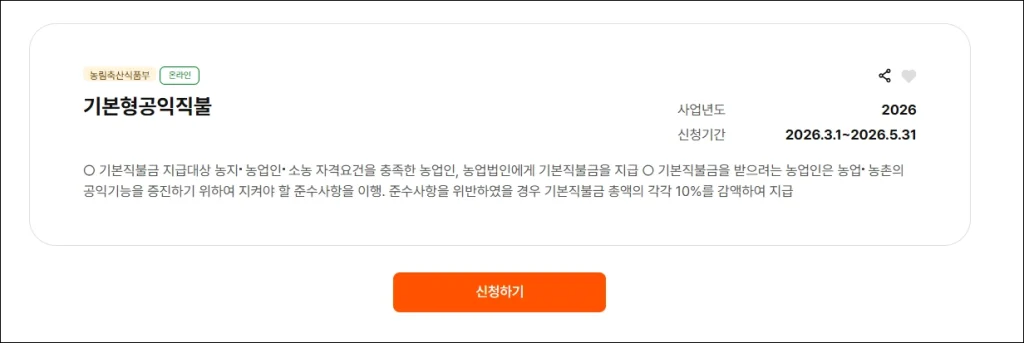 | 온라인 신청 (농업e지) | 2026년 3월 1일 ~ 5월 31일 | 간편신청 대상 외 모든 농업인 |