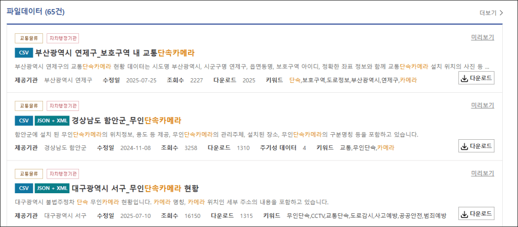 - 활용 방법: ‘무인교통단속카메라 표준데이터’ 검색 → 내려받기 또는 지도 서비스 연동