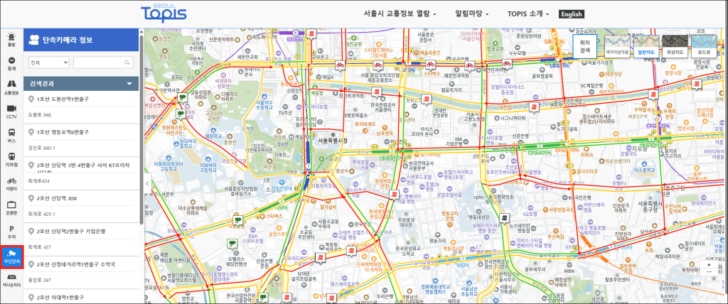 - 각 시·도별로 운영되는 교통정보센터에서는 관내 단속장비의 위치, 구간단속 현황을 지도 기반으로 제공합니다.