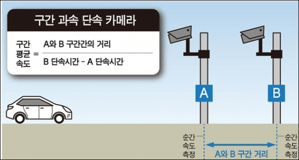 일정 구간 내 시작점과 종료점에서 차량 번호판을 촬영, 구간 통과 시간을 계산해 평균속도로 단속하는 카메라입니다.