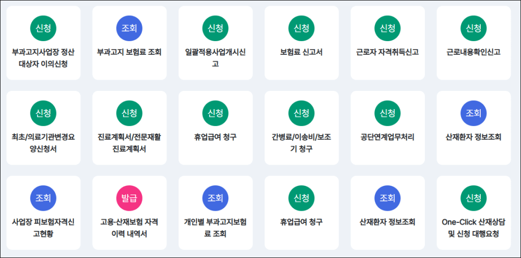 정보 조회 | 보험가입이력, 자격변동 내역, 납부 내역, 증명서 즉시 발급 | 근로자/사업주 확인 및 서류 제출 |