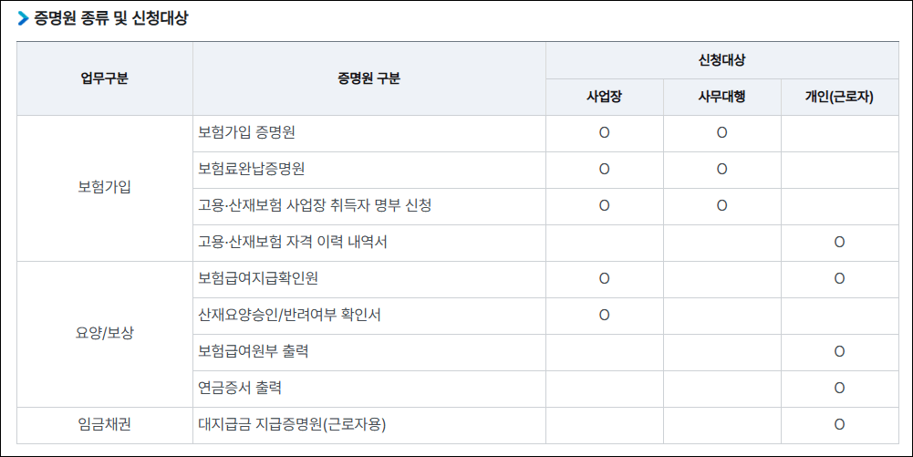 보험가입증명원 발급 | 사업장 보험 가입 사실 증명 | — | 즉시 |