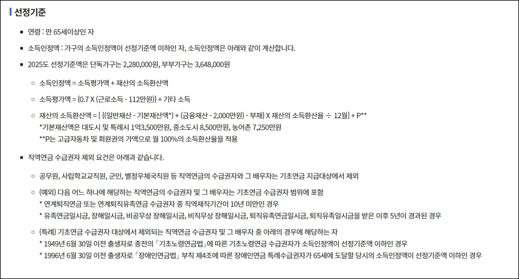 2026 기초연금 수급자격을 안내합니다. 선정기준액은 단독가구 월 247만원, 부부가구 월 395만 2,000원으로 인상되었습니다. 만 65세 이상 대한민국 국적자로 소득인정액이 이 기준 이하이면 수급 가능합니다. 자녀 소득과 재산은 전혀 반영되지 않습니다. 수급자격부터 소득인정액 계산법, 탈락 사유, 신청방법까지 한 번에 정리했습니다.