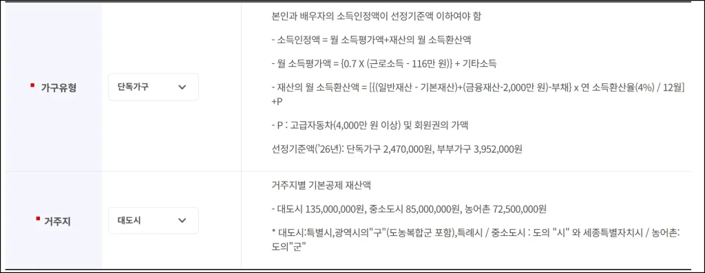 가구의 소득인정액이 2026년 선정기준액 이하여야 합니다.