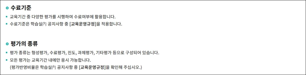 - 출석률 : 전체 교육 시간 중 최소 80% 이상 출석해야 함