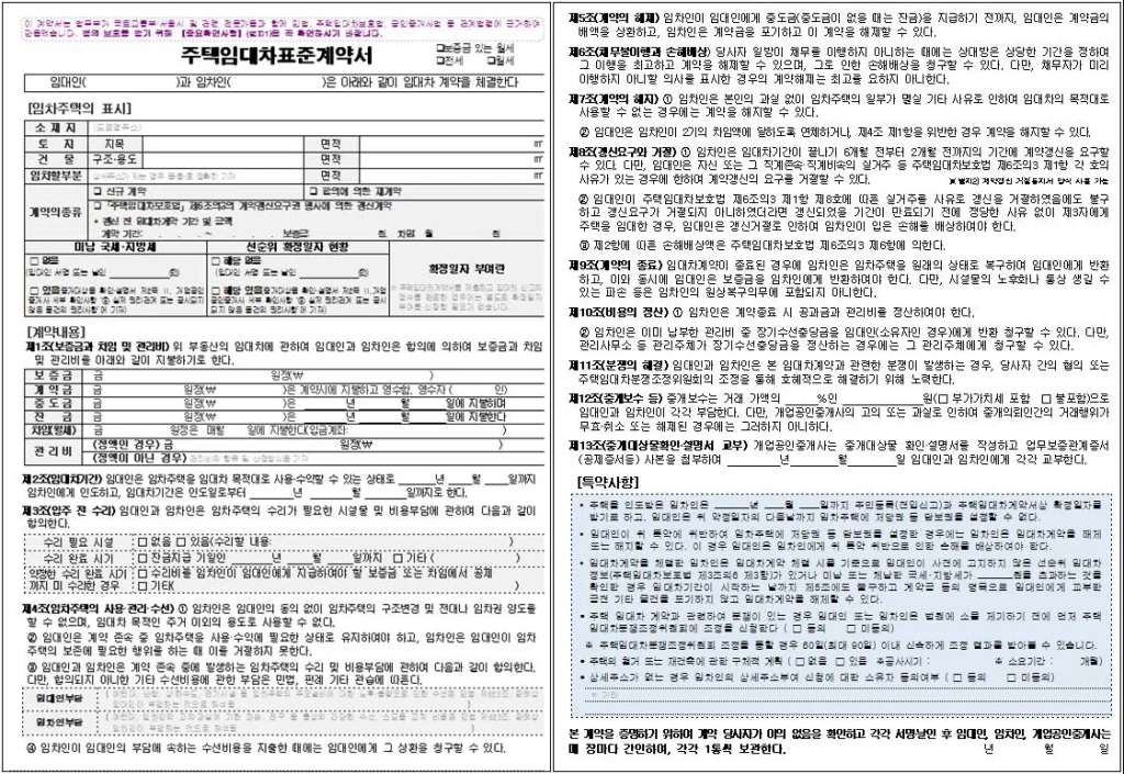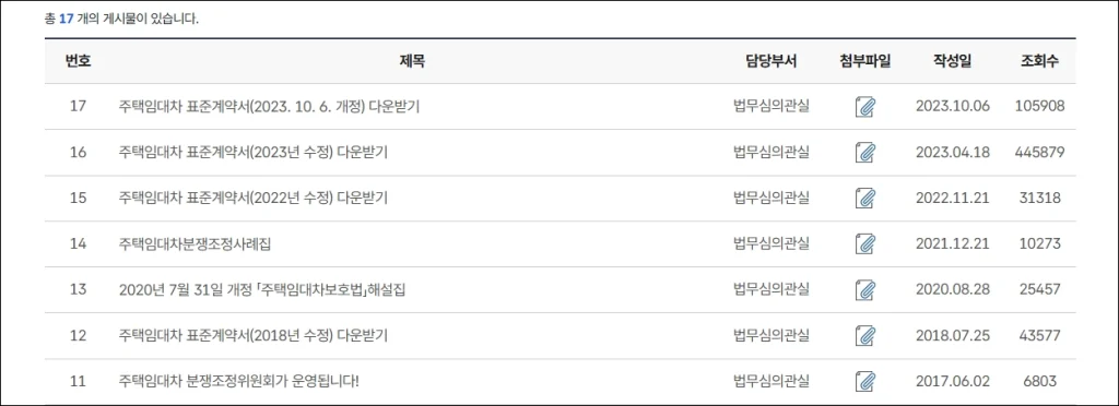 | 주택임대차 표준계약서 | 법무부·국토부 연계 게시물 | hwp, pdf | 주택용, 표준 조항 반영, 2023년 수정본 기준 제공 |