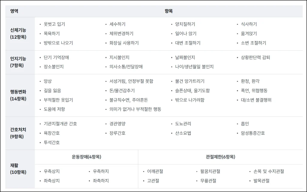 • 3~4등급: 거동이 어렵거나 인지 기능 저하로 일상적인 활동에 도움이 필요한 상태