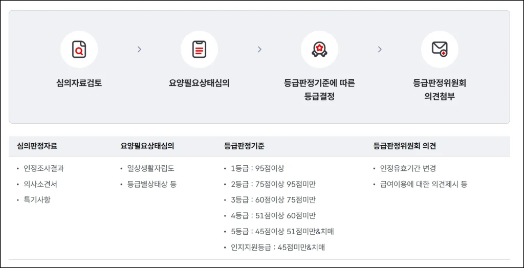 최종 장기요양인정점수가 산출되면 아래 기준표에 따라 등급이 결정됩니다. 점수가 높을수록 일상생활 수행에 더 많은 도움이 필요한 상태를 의미하며, 더 높은 등급(1등급)을 받게 됩니다.