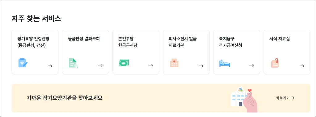 장기요양등급 신청 방법과 절차가 궁금하다면 이 블로그의 관련 포스팅을 함께 참고하시기 바랍니다. 등급 판정을 받은 후 이용할 수 있는 서비스 종류와 월 한도액에 대한 내용도 추후 안내할 예정입니다. 궁금한 사항은 국민건강보험공단 고객상담센터(국번 없이 1577-1000)로 문의하시기 바랍니다.