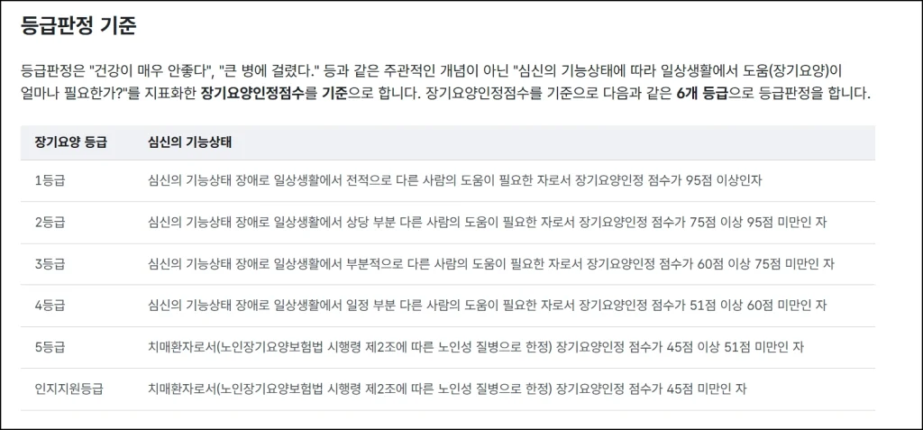 • 5등급·인지지원등급: 신체 기능은 비교적 유지되어 있으나 치매 증상이 있는 경우