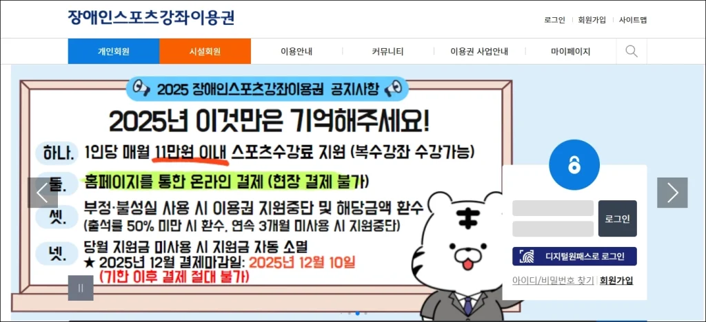 - 국민체육진흥공단 장애인스포츠강좌이용권 안내 페이지.