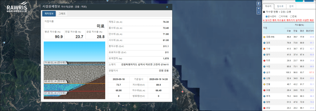 - 수위·저수율·수량 등 상세정보 및 그래프 확인 가능