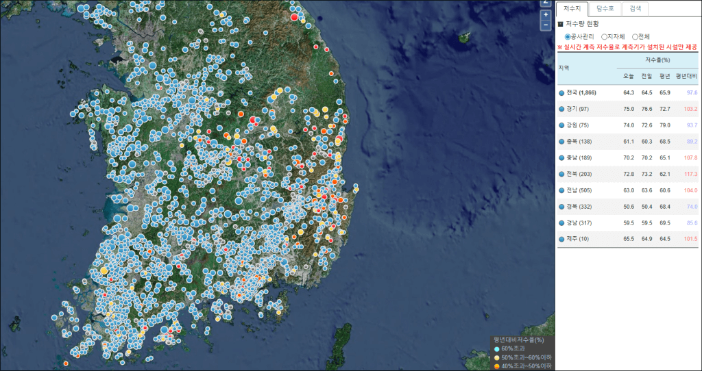 예, 모바일 앱과 웹사이트 모두 실시간 현황을 지원하며, 주요 저수지별로 위치·수위·저수율·날씨·방류일정 등