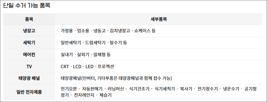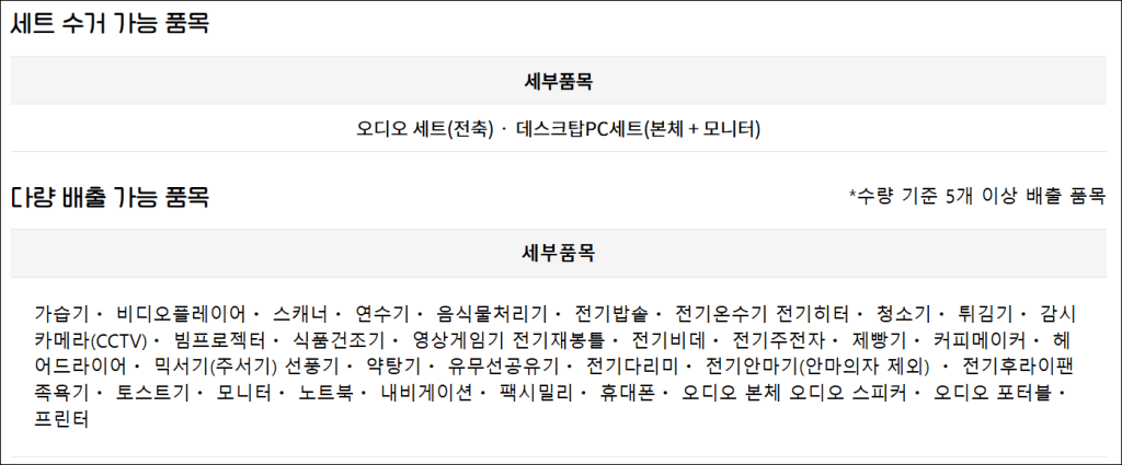 • 주요 대형 및 소형가전 다수 품목 수거, 정확한 품목은 지역별 안내 및 홈페이지 공지 참고