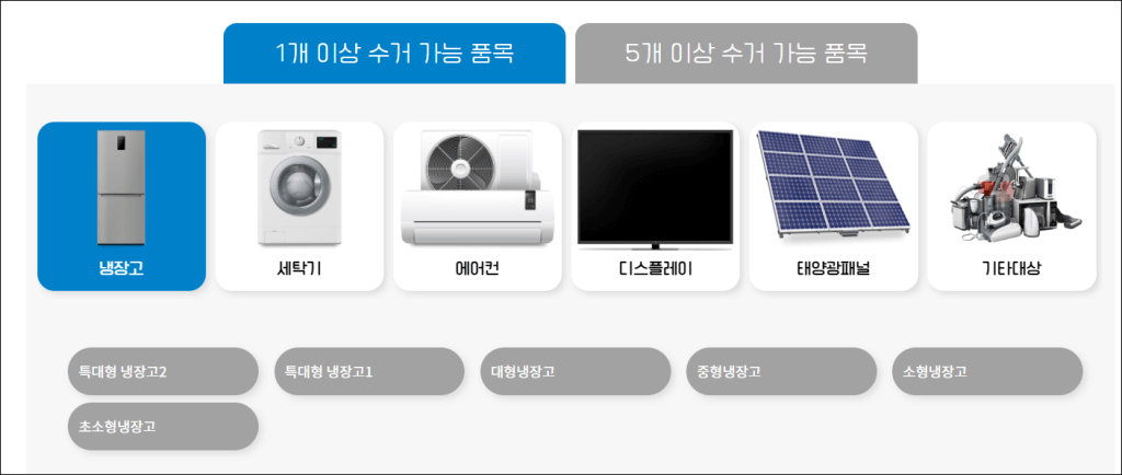 • 소형가전은 5개 이상 동시에 배출하는 경우에 무상수거가 가능, 대형가전 신청 시 소형가전 5개 미만이라도 동시 수거