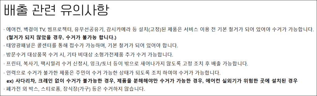 특히 설치형 가전이나 대형 제품은 안전 문제와 수거 효율을 위해 철거 및 배출 위치를 명확히 지정해야 합니다.