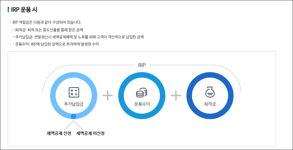 | 사후 이체 | 일반 계좌 → IRP 계좌 | 60일 이내 이체 시 세금 환급 가능 | 기한 초과 시 과세이연 불가 |