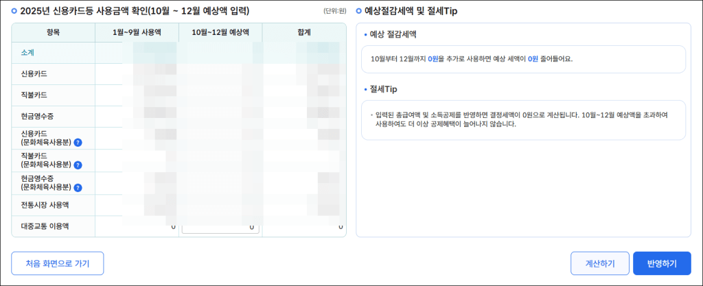 · 결과를 토대로 남은 10-12 월(혹은 11-12월) 동안 카드·현금영수증 사용 전략 수립