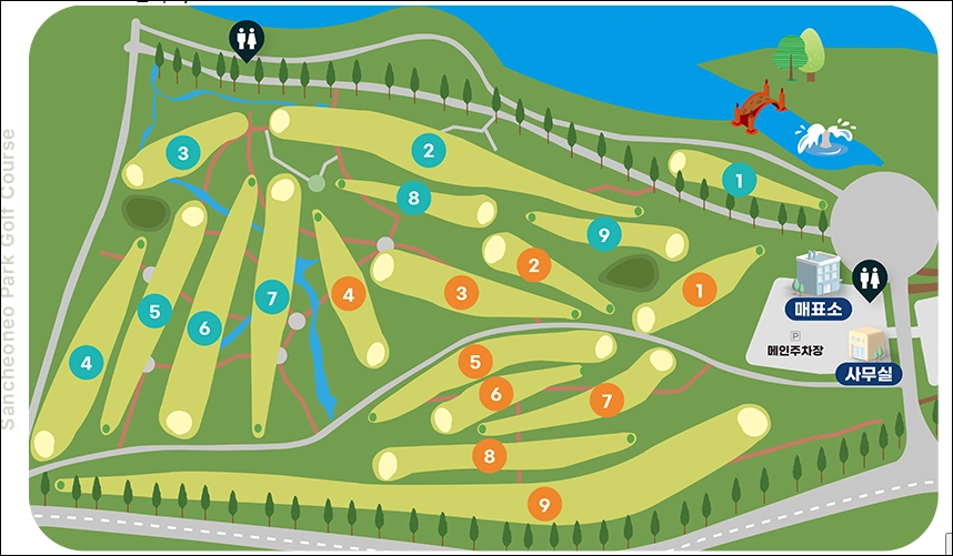 여러 전문 블로그 및 전국 투어 후기 자료에 따르면 산천어 파크골프장은 제1·제2구장으로 나뉜 36홀 코스를 운영합니다.