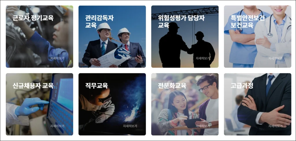 주요 기능- 법정 안전·보건 교육 제공(근로자 정기교육, 관리감독자, 신규채용자, 특별안전보건 등)