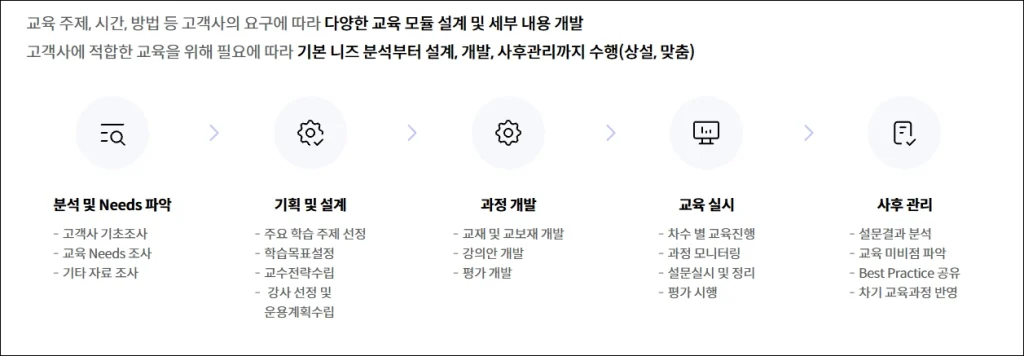 이 과정들은 직무교욱센터에서 따로 신청·관리되며, 수료 기준은 출석률 80% 이상(집체) + 교육 내용 이해도 평가 통과를 원칙으로 합니다.
