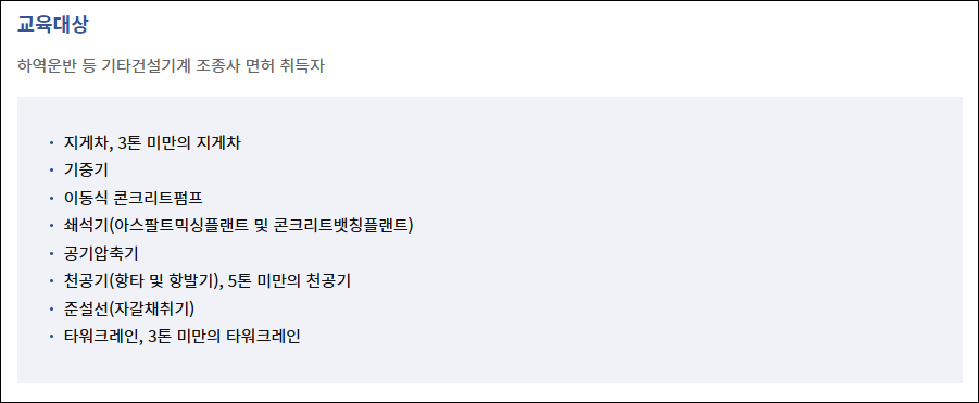 • 운전면허: 1종 보통운전면허 보유 시 해당 교육 이수만으로 소형건설기계 조종 면허 가능.