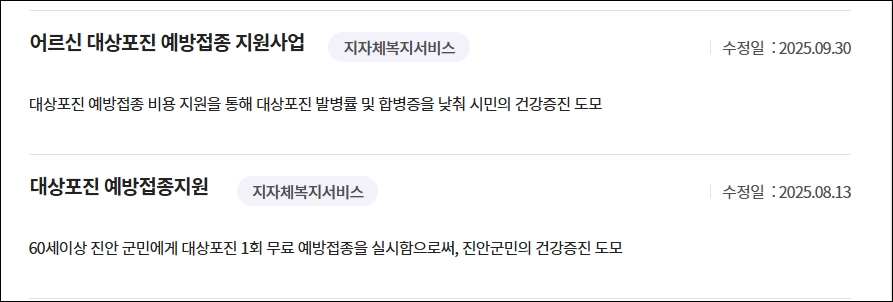 - 지원내용: 대상포진 예방접종 비용 지원(구체 금액은 군 공고에 따름).