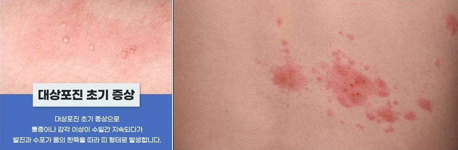- 주요 증상: 띠 모양 수포, 극심한 신경통, 접촉 시 통증 악화, 피로감, 발열 등.