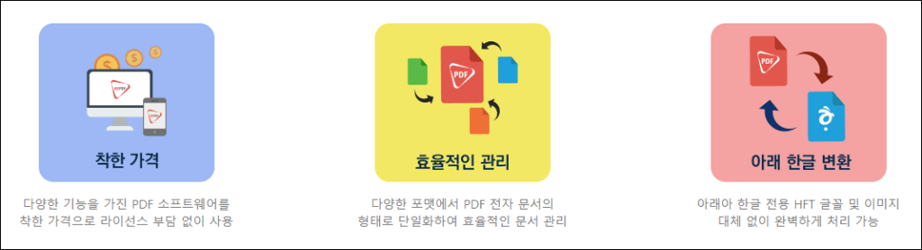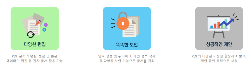 • 파일 변환 및 병합: DOC, PPT, 이미지 등 다양한 파일을 PDF로 변환, PDF 파일 병합/분할